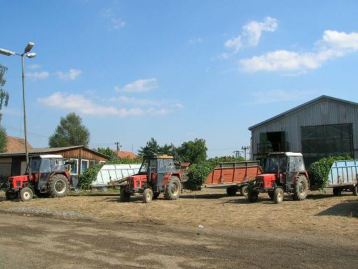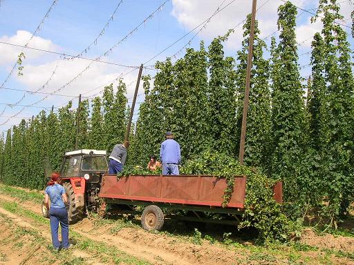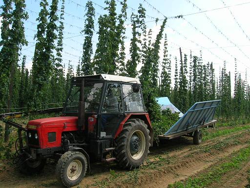 Strojní strhávání rév ve chmelnici pomocí strhávače Soller.
