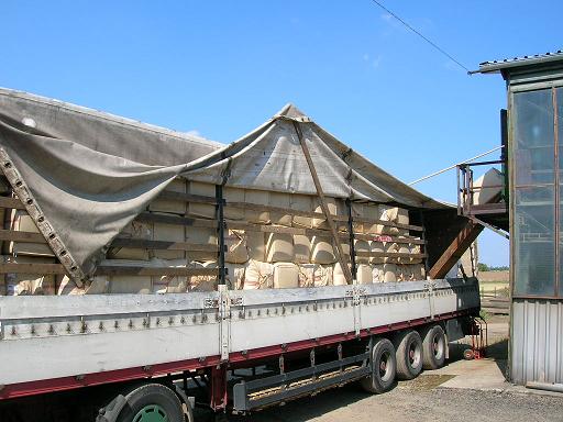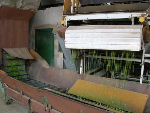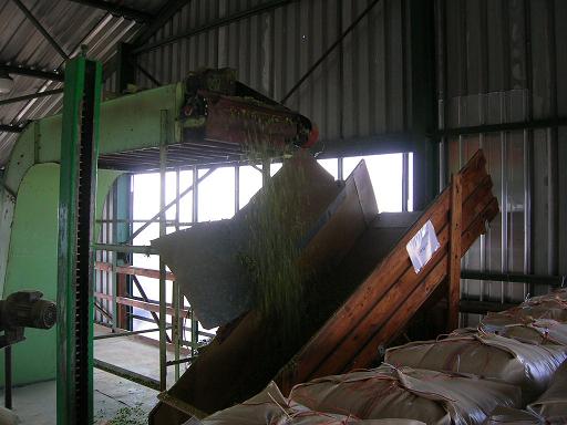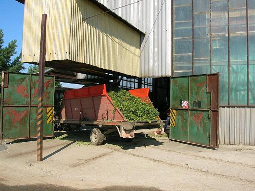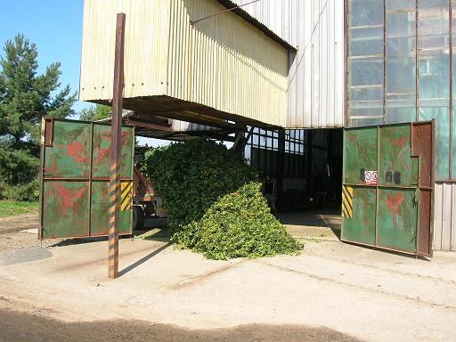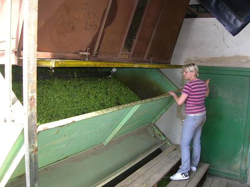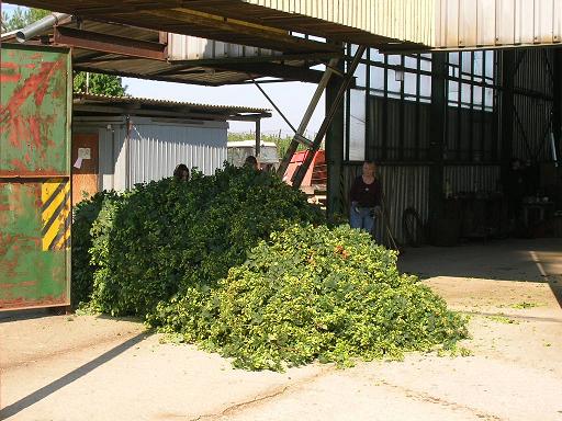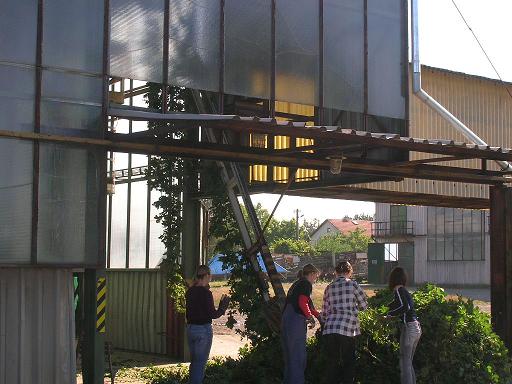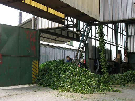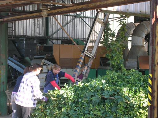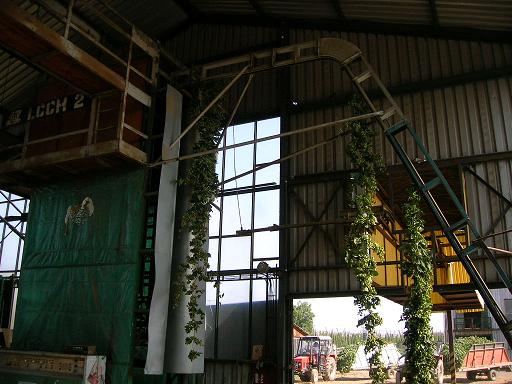 Zavěšené chmelové révy na vstupu česačky LČCH-2